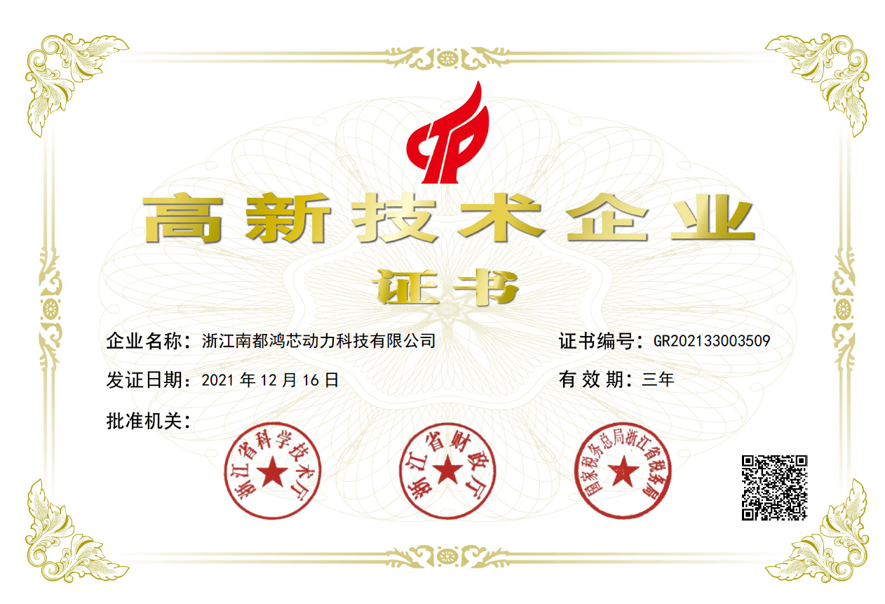 近日,福利姬 全资子公司——浙江南都鸿芯动力科技有限公司获得国家高新技术企业认定。根据相关规定,南都鸿芯自通过高新技术企业认定起连续三年,可享受国家关于高新技术企业的税收优惠政策。